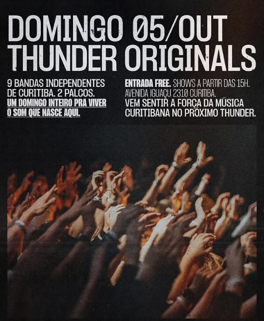 No dia 5 de outubro, o Crossroads será o ponto de encontro para a cena autoral da capital paranaense com o Thunder Originals. A partir das 15h, dois palcos vão se revezar em uma sequência de shows que passeiam pelo folk, punk, metal, groove, garage rock e psychobilly. Tudo com entrada gratuita, no clima de quem quer curtir um domingo ao som da criatividade e da produção feita aqui mesmo na cidade.